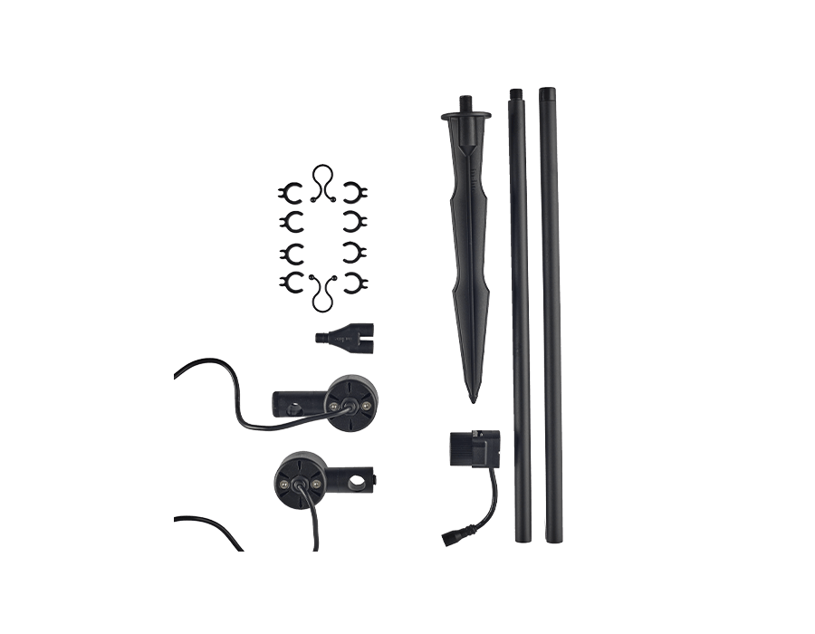 Draai de delen van de staander in elkaar en plaats de afdekdop (eventueel kan ook 1 deel van de staander gebruikt worden). Schuif de spots over de staander en draai deze op de gewenste positie vast met de draaiknop. Klem de kabel vast op de staander met de kabelklemmetjes. Draai de grondpen in de staander en plaats het armatuur in de grond. Gebuik de kabelbundelaars om de kabels onder de grond netjes te bundelen.
